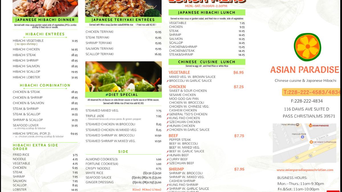Welcome to ASIAN PARADISE, a hidden gem located at 116 Davis Ave, Pass Christian, MS. This delightful restaurant offers a diverse menu that showcases the best of Chinese and Japanese cuisine. Customers rave about the authentic flavors and generous portions, making it a go-to spot for lunch and dinner.
